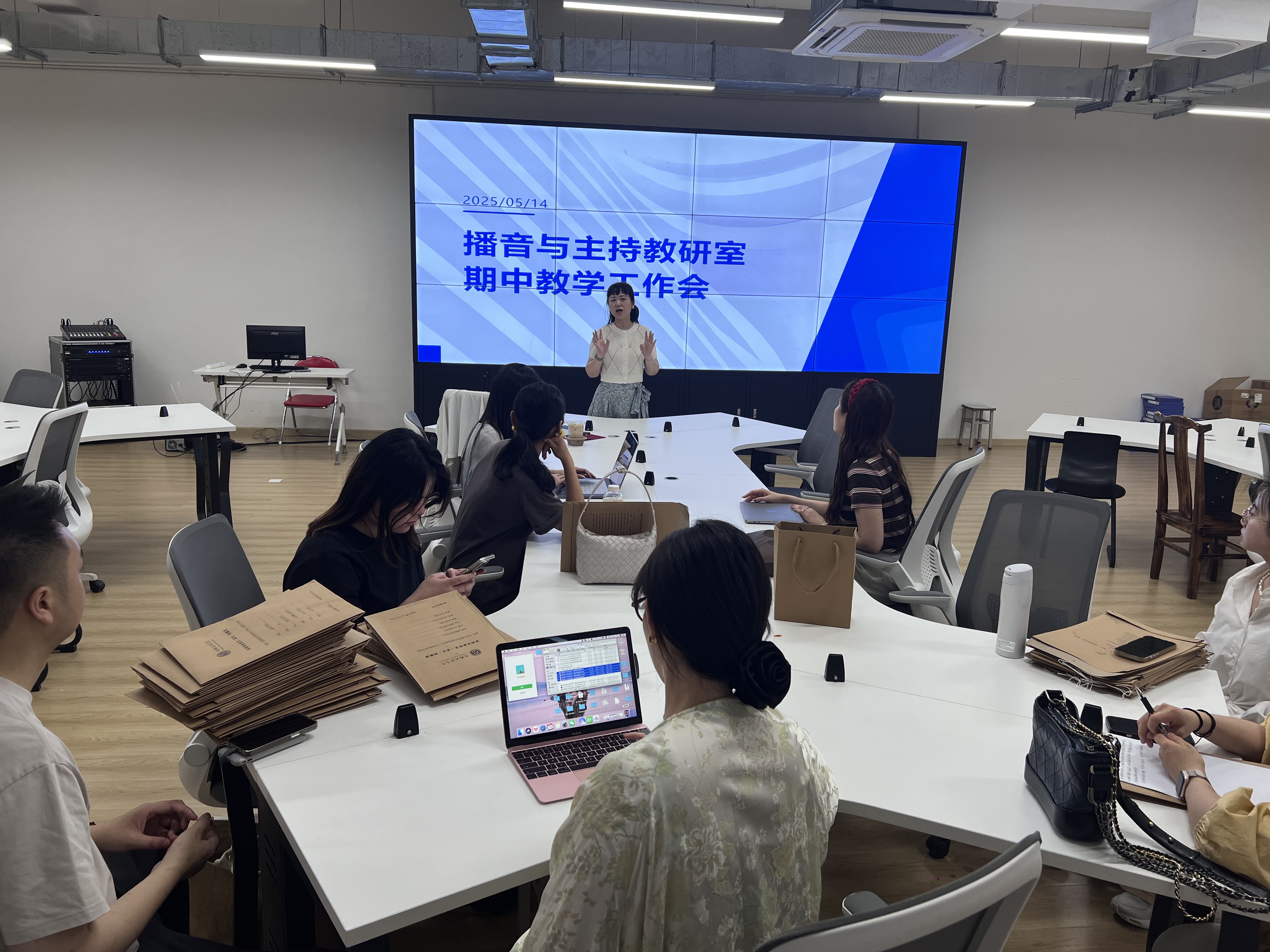 2025年5月14日星期三,播音与主持教研室专职教师集中在艺术楼融媒体实训室210B开展期中教学工作会,本次会议议程共以下5项:师德师风建设、人才招聘工作、考试材料归档、毕业论文收尾及期末展演安排。