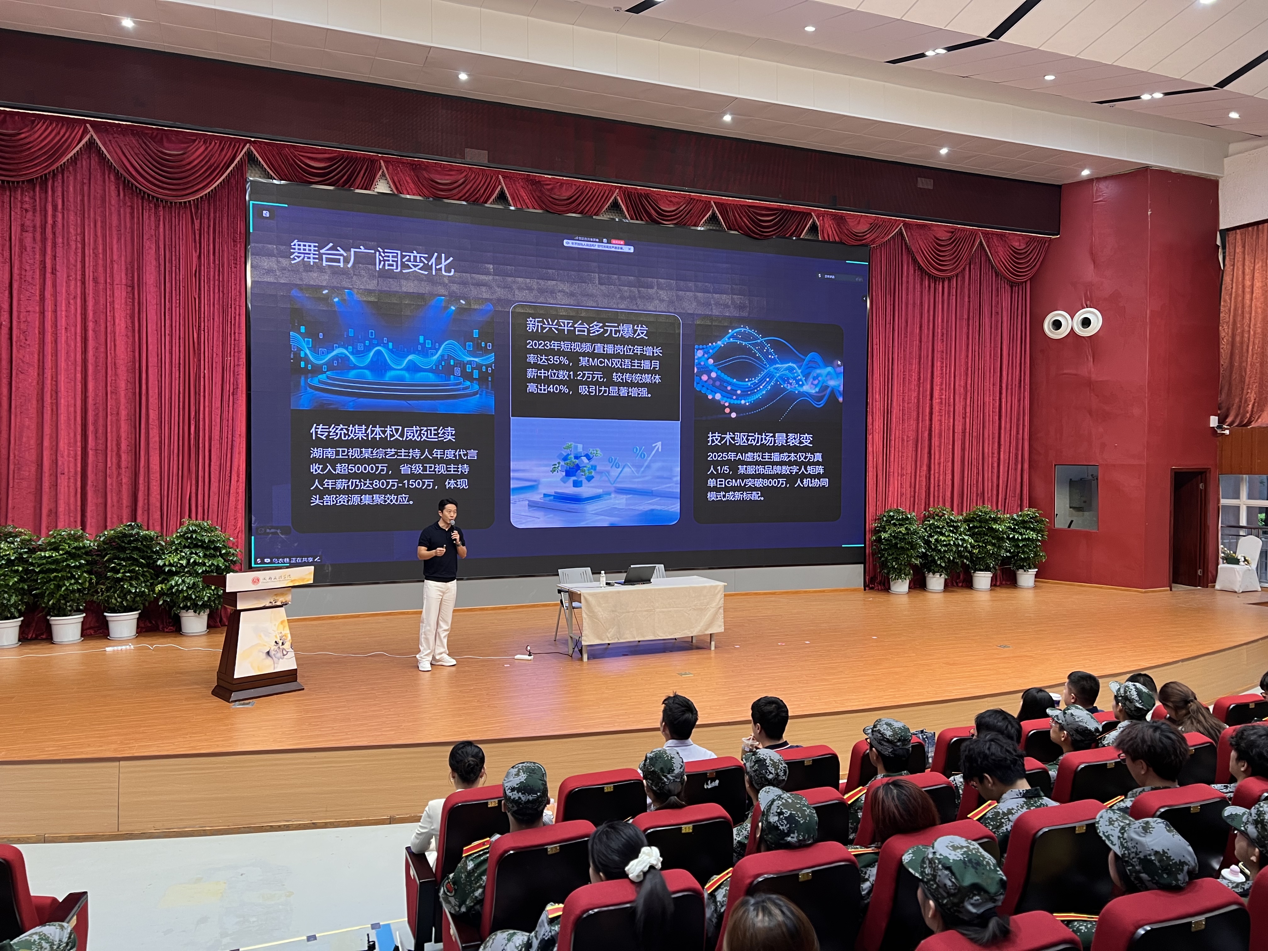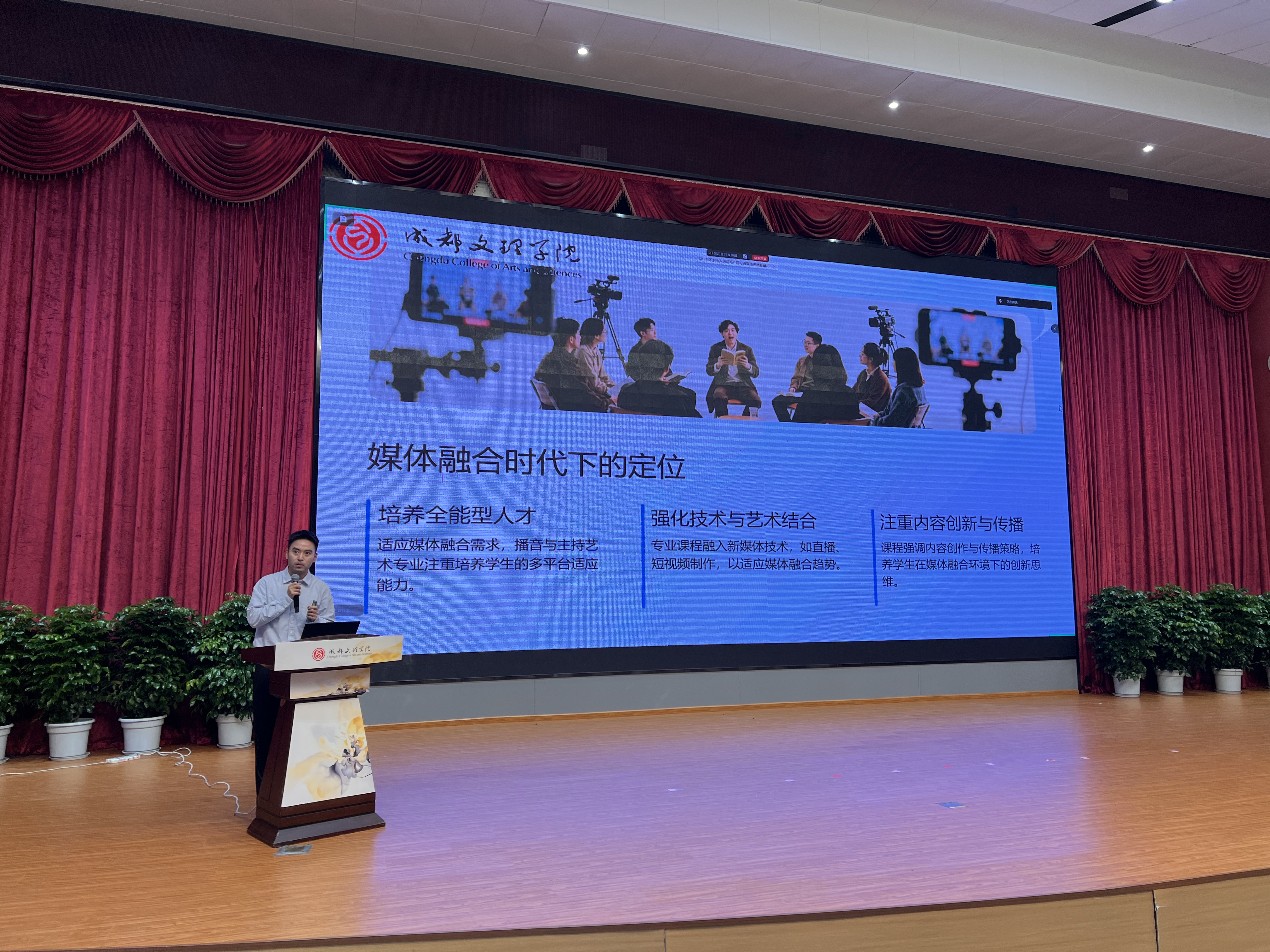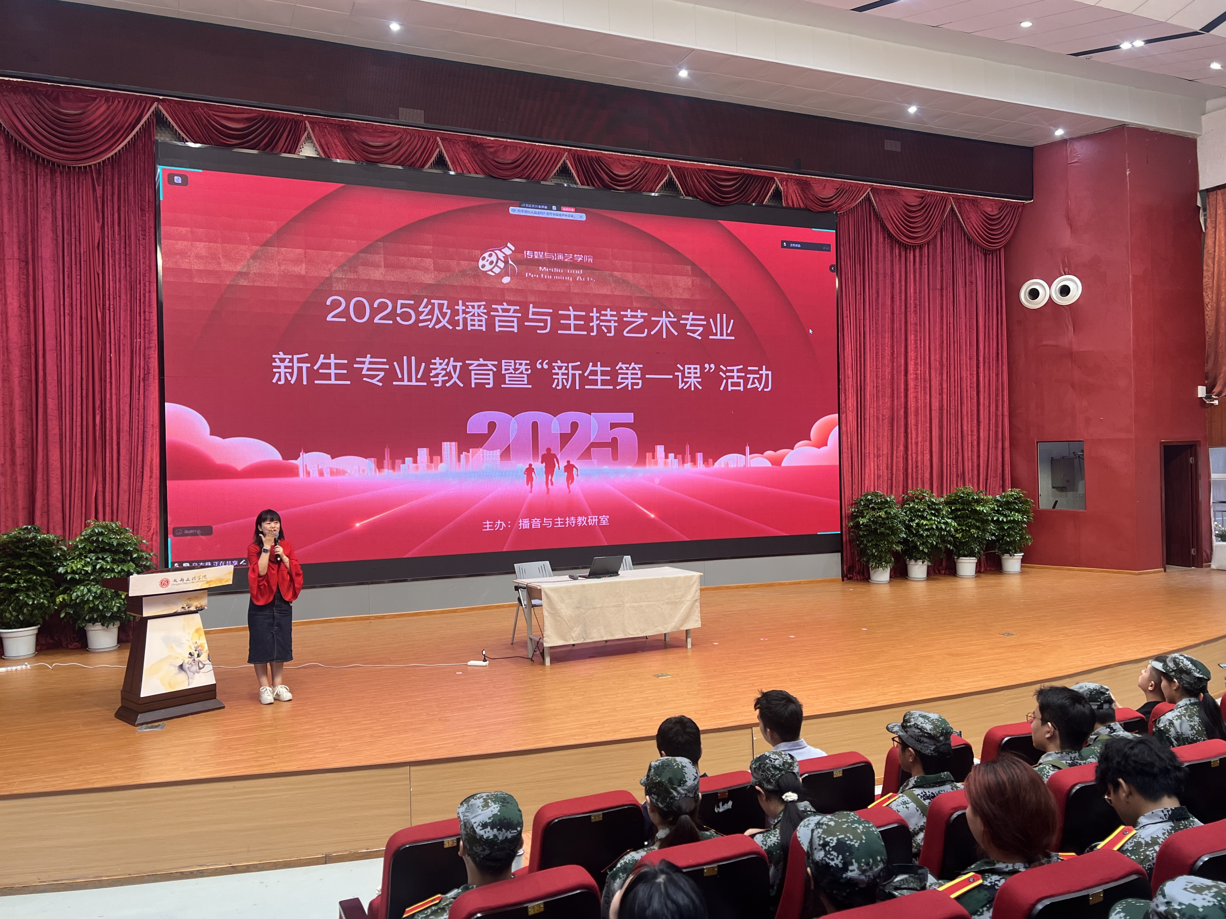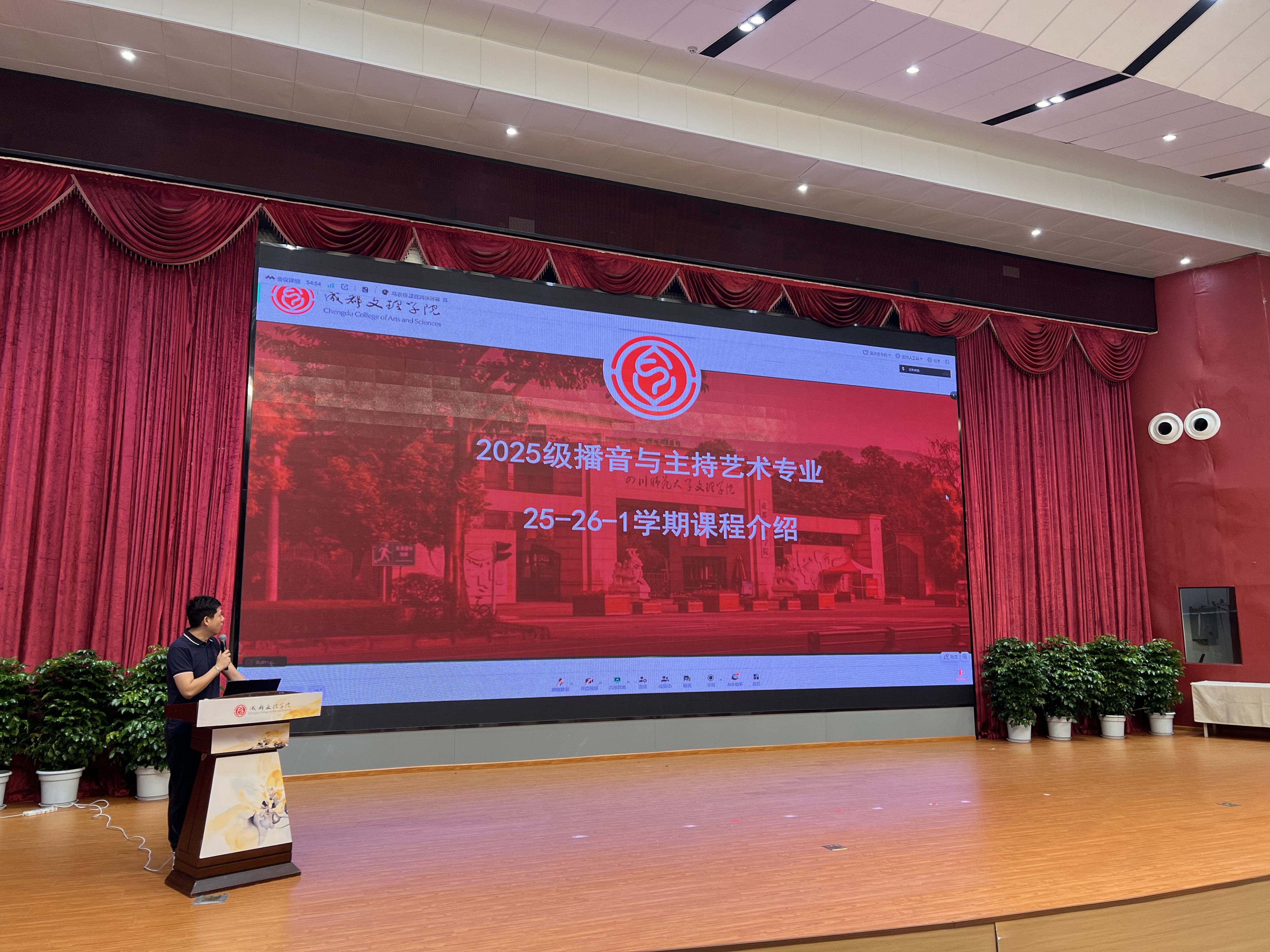 明确专业方向后,具体的课程学习成为新生关注的焦点。播音与主持教研室教师王旭晟副教授详细介绍了一年级的课程设置、主要内容、培养目标与考核方式。他鼓励同学们尽快适应大学学习节奏,提前做好规划,为专业学习打下牢固根基。紧随其后的“师者风采”环节,大一年级专业教师走上舞台更直观地展示了专业教师团队的魅力与实力,每位老师也亲切地为同学们送上了寄语与祝福,增强了同学们的专业归属感。
