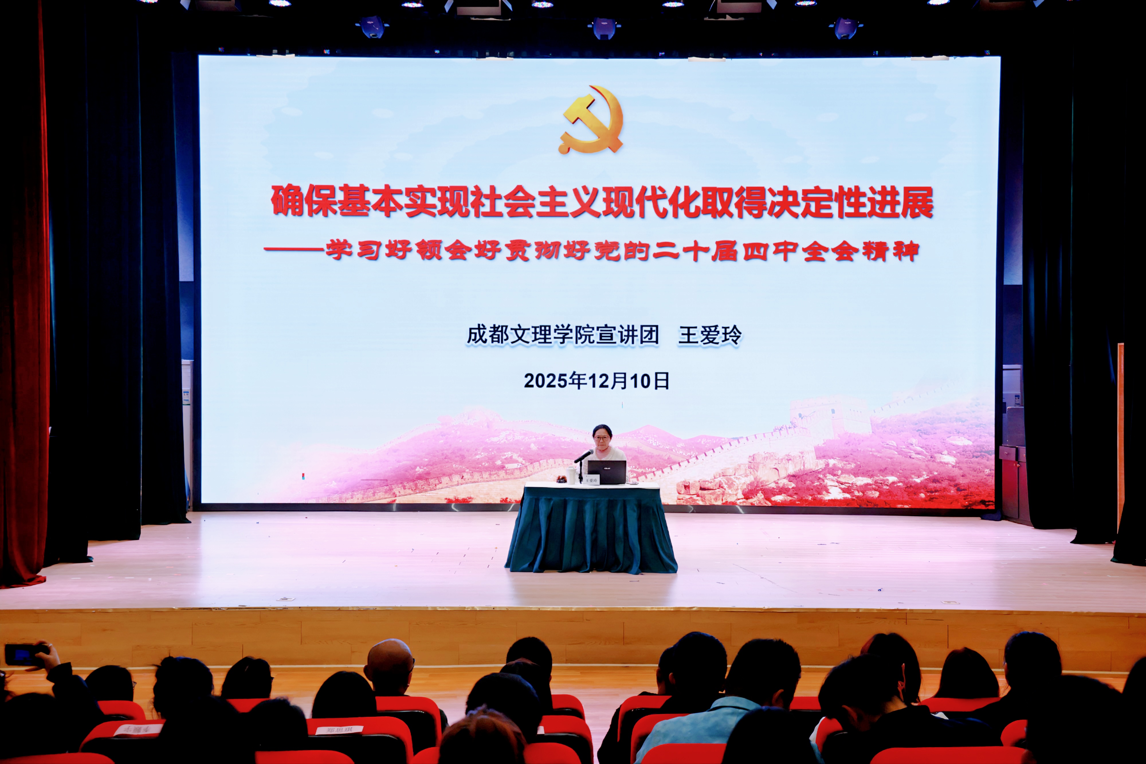 报告会上,王爱玲紧紧围绕习近平总书记在全会上的重要讲话和《建议》,阐明了全会的重大意义,对“十四五”时期我国发展取得的重大成就,“十五五”时期我国发展所处的历史方位,党中央关于国内外形势的基本判断,“十五五”时期经济社会发展的指导方针和主要目标,“十五五”时期的战略任务和重大举措,“十五五”时期经济社会发展的根本保证,贯彻落实全会精神要着重把握的重点进行了解读;结合学习贯彻省委十二届八次全会精神,对省委贯彻落实习近平总书记对四川工作系列重要指示精神和党中央决策部署、在对标对表中谋划推动四川“十五五”发展的总体考虑进行了解读。针对教育行业特点,王爱玲阐释了教育在以中国式现代化全面推进强国建设、民族复兴伟业中的基础性、战略性支撑和先导性、全局性作用,号召教师要在建设教育强国、实现“十五五”蓝图的新征程中做有理想负责任的行动主义者,青年员工要让美好青春与国家发展“同频共振”、持续奋力书写为中国式现代化挺膺担当的青春答卷。