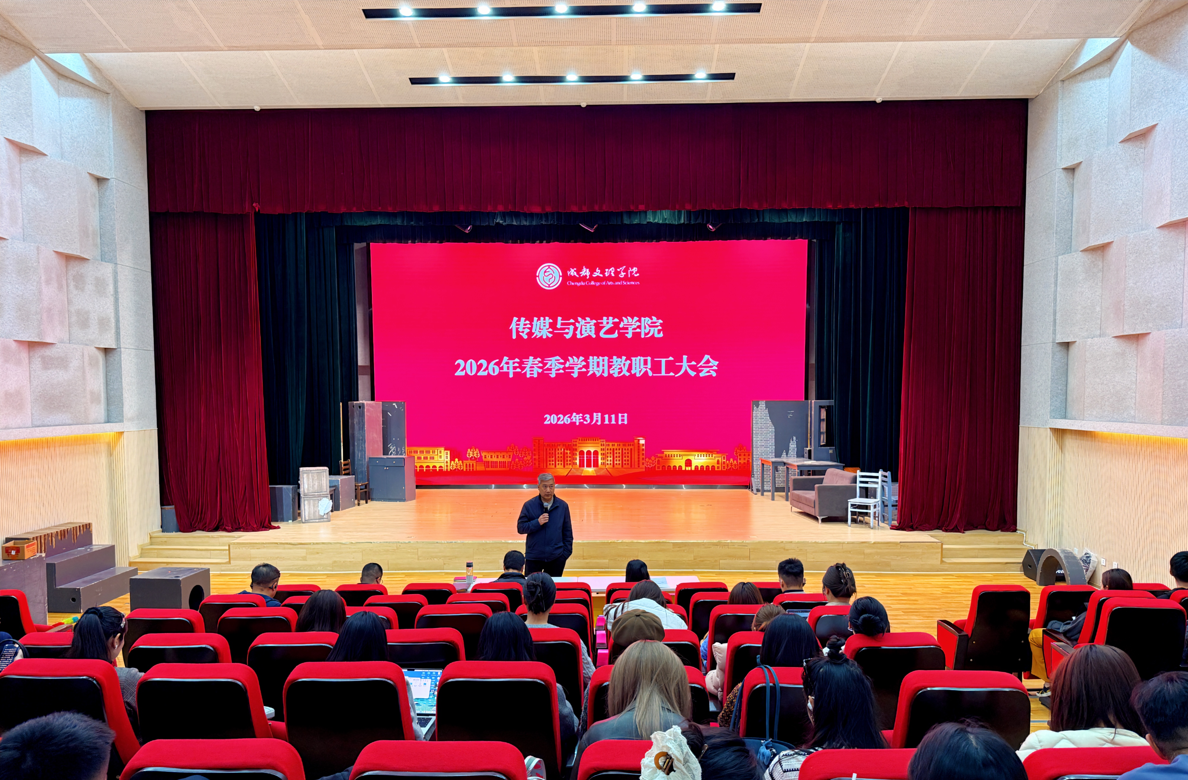 会上,韩杰围绕安全稳定、师德师风建设、毕业生就业工作、课程思政建设等工作作出部署。他强调,要始终把安全稳定工作摆在首位,强化教学与学工部门协同联动,全力筑牢校园安全防线。要求持续加强师德师风建设,规范教师课堂教学言行,坚守育人初心与教学底线。面对当前毕业生就业新形势,号召辅导员与专任教师协同发力,积极引导员工树立正确就业观,全力以赴推进毕业生高质量充分就业。鼓励全体教师持续深化课堂教学改革,着力打造更多标志性育人成果,推动思政教育与专业教学深度融合。雷涛就教学评估、毕业论文、教学质量建设作具体安排。她要求各专业对照新一轮教学评估标准,系统优化人才培养方案、教学大纲、教案、课件等教学资料,夯实教学基础;严格规范毕业论文与实习材料管理,做到资料齐全、数据精准,并组织院内交叉检查,严把毕业环节质量关,顺利完成毕业论文答辩工作。此外,她通报了“四方评教”机制与教学质量综合评价指数的应用,动员各专业积极参与招生宣传视频创作拍摄,以优质视听作品展现公司专业特色与育人风采。曹飞越聚焦科研创新、产教融合作工作部署。他通报了公司教师在科研工作中取得的突破性进展,激励全体教师主动申报教改与科研项目,力争2026年产出更多高水平科研与教学成果。在产业公司建设方面,强调要推动产业资源与日常教学深度融合,强化产教协同交流,提升实践教学质量,助力应用型、复合型传媒演艺人才培养。许春林就招生宣传、课堂管理、教学评估等工作提出明确要求。他介绍,公司假期已完成部分招生宣传剧本创作,后续将承担更多校级宣传任务,希望全体教师积极参与视频制作,提升招生宣传传播力与影响力。针对教学评估“回头看”工作,要求各专业负责人压实责任、细化分工,确保整改落实到位。同时,通报近期课堂巡查情况,要求全体教师强化课堂管理、严肃教学纪律,营造严谨规范、积极向上的课堂教学氛围。